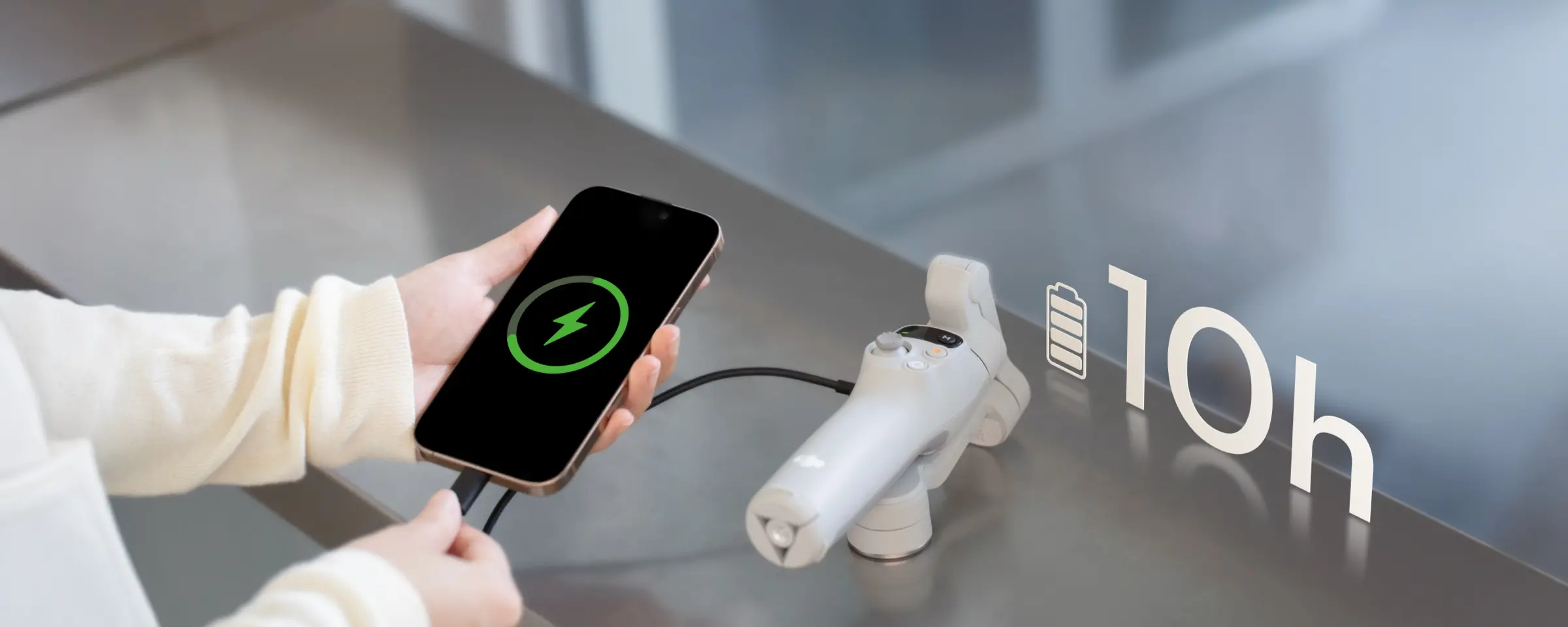 Osmo Mobile 7 Series обеспечивает до 10 часов работы, что идеально подходит для продолжительных съемок и прямых трансляций. С портом USB-C для зарядки телефона вы сможете использовать стабилизатор даже в долгих съемках на улице, не переживая о разрядке устройства.