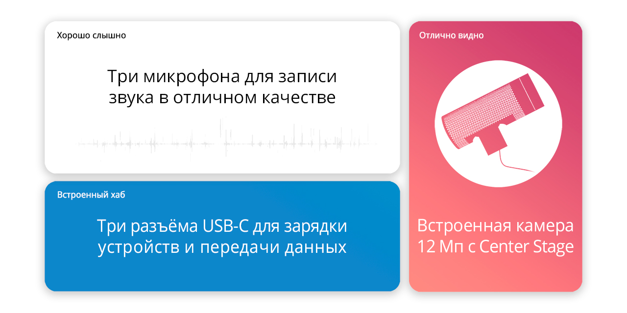 Studio Display представляет собой концепцию монитора с возможностью преобразования любого Mac в iMac 5K, при этом оставаясь независимым от компьютера. Встроенные динамики с поддержкой Dolby Atmos обеспечивают объёмное звучание, веб-камера с широким углом обзора и функцией Center Stage автоматически панорамирует изображение, удерживая вас в центре кадра во время видеозвонков. Также в монитор встроены три микрофона с шумоподавлением. Встроенный процессор A13 позволяет монитору самостоятельно обрабатывать команды Siri, обеспечивая безупречную работу голосового ассистента независимо от подключённого Mac.