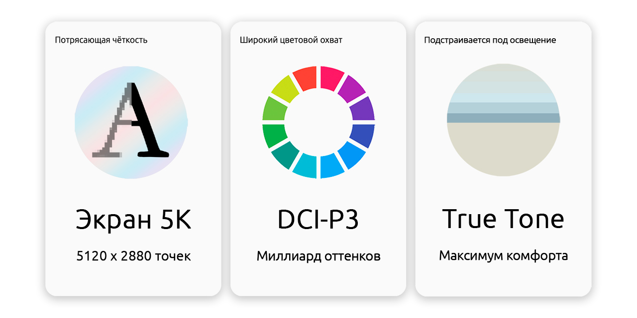 В Studio Display используется высококачественный 27-дюймовый IPS-дисплей, который ранее использовался в iMac 5K, но с улучшениями. Яркость увеличена на 20% и теперь составляет 600 нит. Технология True Tone и цветовое пространство DCI-P3 обеспечивают до миллиарда цветов, а высокое разрешение гарантирует чёткость шрифтов и детализацию при работе с изображениями и монтаже видео 4K в масштабе 1:1. Как и всегда у Apple, цвета монитора откалиброваны прямо "из коробки".