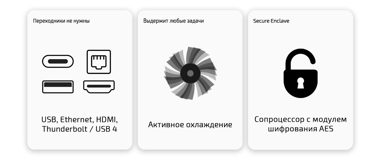 Порты Thunderbolt / USB 4 на Mac mini обеспечивают отличную гибкость для подключения разнообразных устройств и аксессуаров. Вы можете подключать внешние SSD, большие мониторы и телевизоры, а также специализированные гаджеты. Максимальная скорость передачи данных достигает 40 Гбит/с, а наличие хабов и адаптеров позволяет расширить возможности Mac mini, добавив порты USB-A, USB-C, HDMI, Ethernet и аудиоразъём с поддержкой высокоимпедансных наушников.