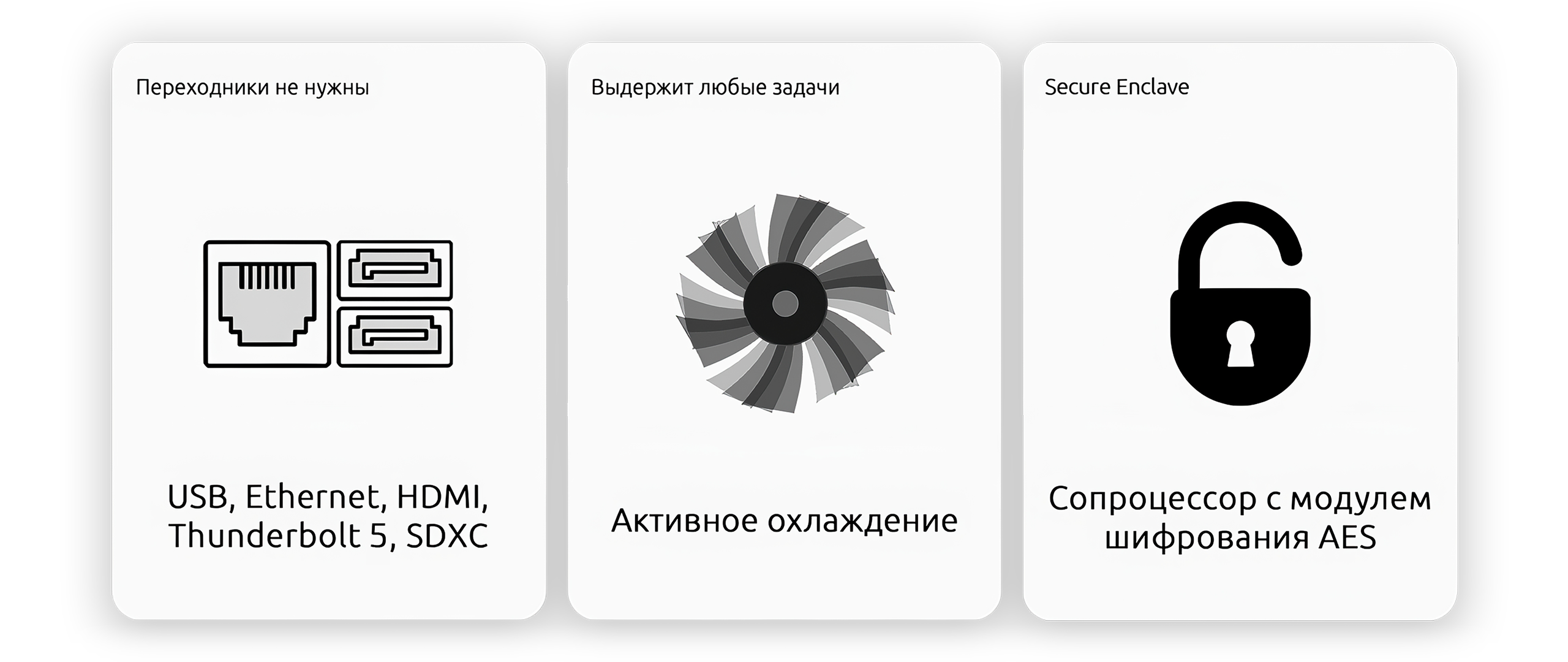 Mac Studio оснащён продуманной системой охлаждения, которая предотвращает перегрев даже при максимальных нагрузках. Вентиляторы остаются практически бесшумными в обычном режиме работы, а шум усиливается только при интенсивном использовании ресурсоёмких приложений. Также доступны различные режимы работы: стандартный, тихий (энергоэффективный) и режим максимальной производительности, который активируется при необходимости, например, при экспорте больших файлов.