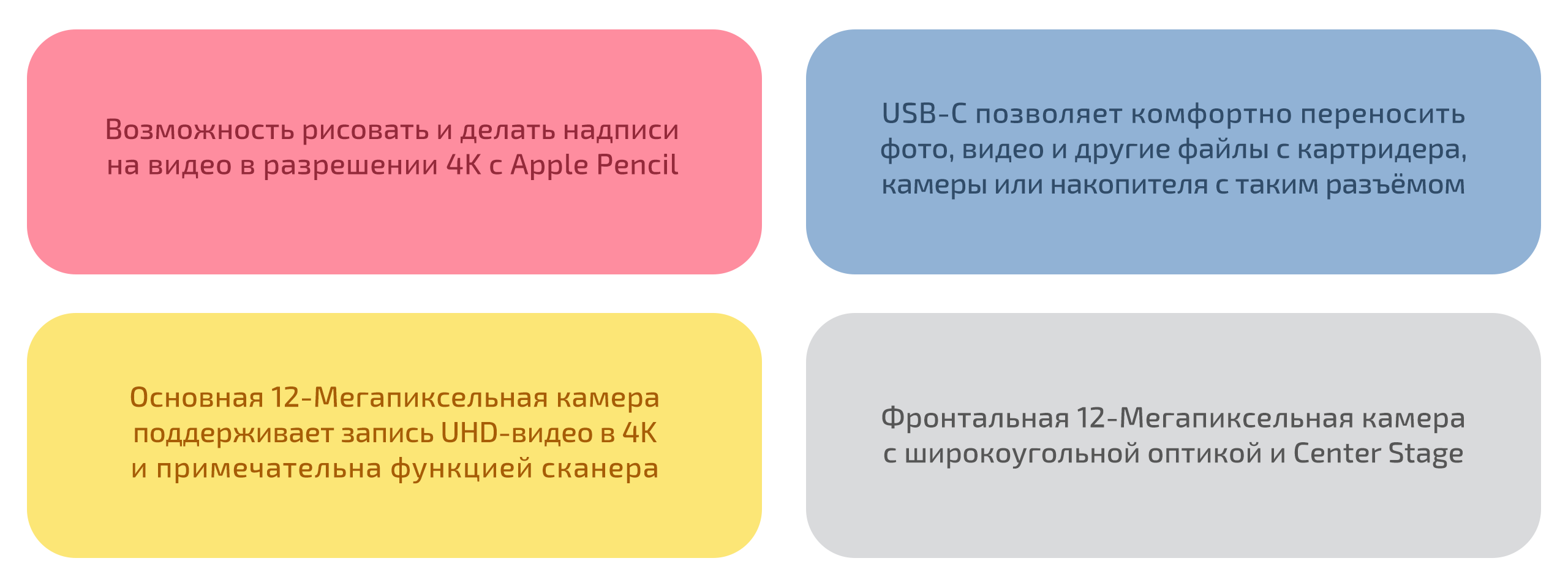 Основная камера снимает видео в 4K с продвинутой стабилизацией и автофокусом, а фронтальная 12 Мп сверхширокоугольная камера поддерживает технологию Center Stage, которая держит пользователя в центре кадра во время видеозвонков — идеально для общения по FaceTime и Zoom.