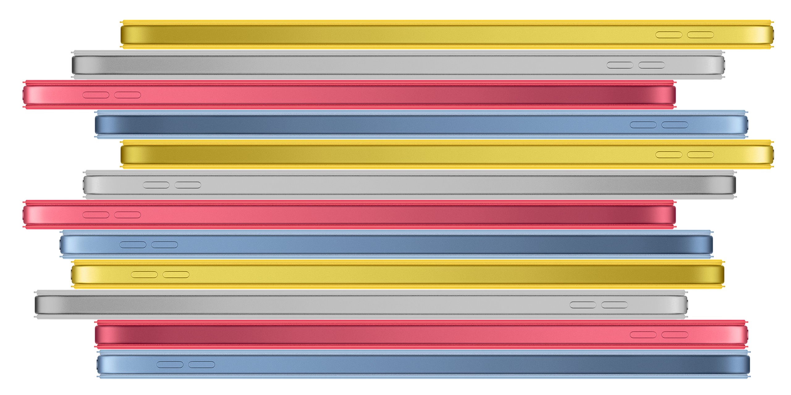 iPad 10 получил тонкий алюминиевый корпус с обновлённой палитрой: классический серебристый, яркий розовый, жёлтый и голубой. Экран практически полностью занимает переднюю панель, а Touch ID теперь встроен в кнопку включения. Фронтальная камера перенесена на длинную сторону корпуса, чтобы общение в альбомной ориентации было ещё удобнее.