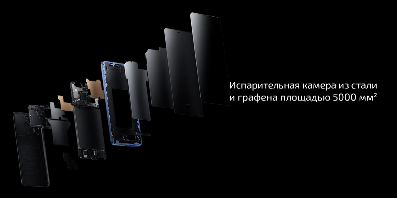 Система охлаждения с графеновыми элементами и стальной пластиной предотвращает перегрев даже при высоких нагрузках. Смартфон сохраняет стабильную работу при длительном использовании в играх, потоковом видео и многозадачности.