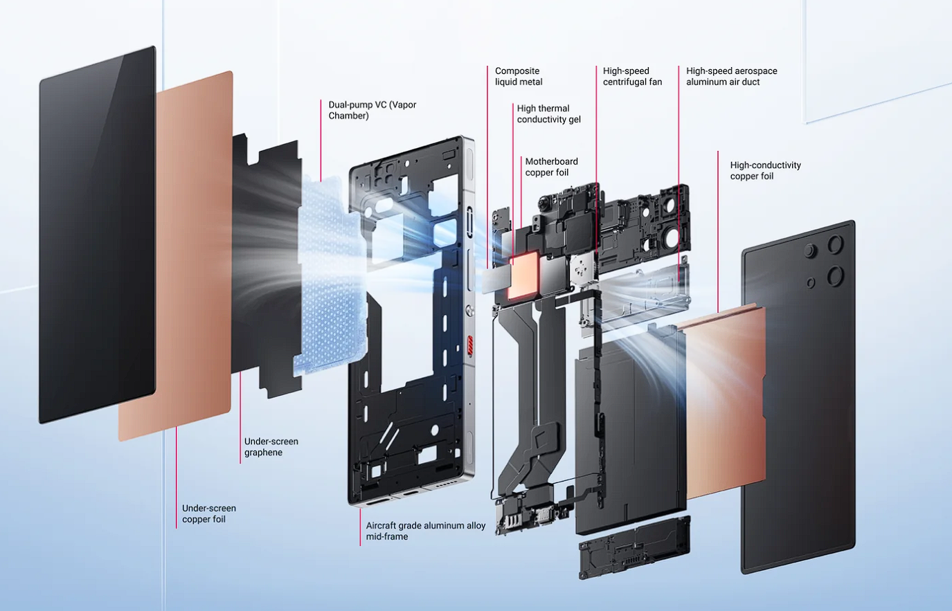 Аккумулятор ёмкостью 7050 мАч с технологией кремний-углеродных анодов гарантирует до 6.2 часов непрерывной игры в Genshin Impact или до 52 часов в режиме ожидания. Быстрая зарядка мощностью 100 Вт позволяет зарядить устройство за короткое время, даже во время игр, благодаря интеллектуальному контролю температуры.